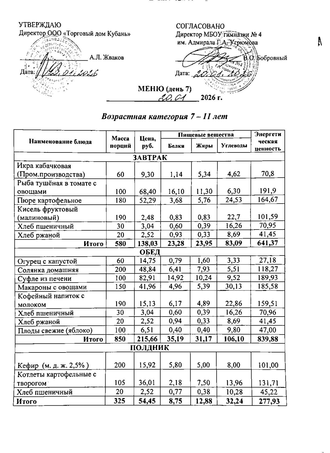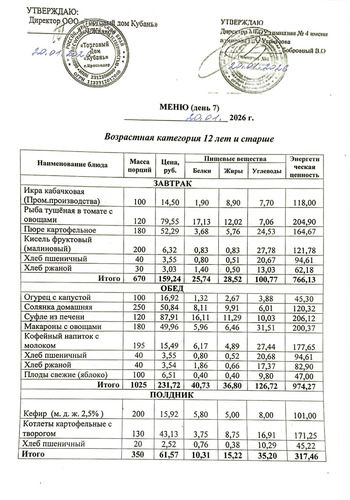 Меню 20.01.2026